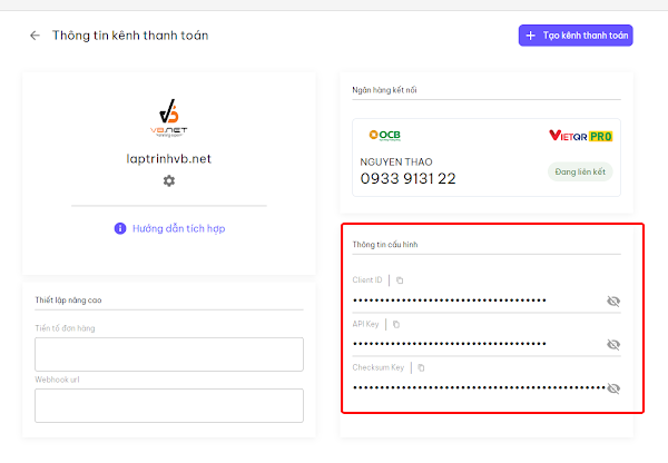 Khi tạo một kênh thanh toán, sẽ có thông tin như hình bên dưới: